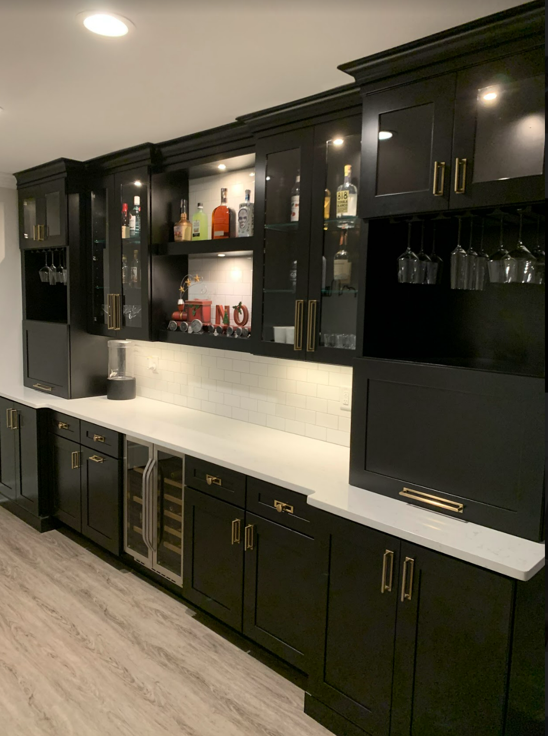 Sunken living room floor raised, flooring replaced, new trim installed, walls refinished, fireplace painted, cabinets replaced, fixtures and hardware replaced. All add a dramatic change in this space.